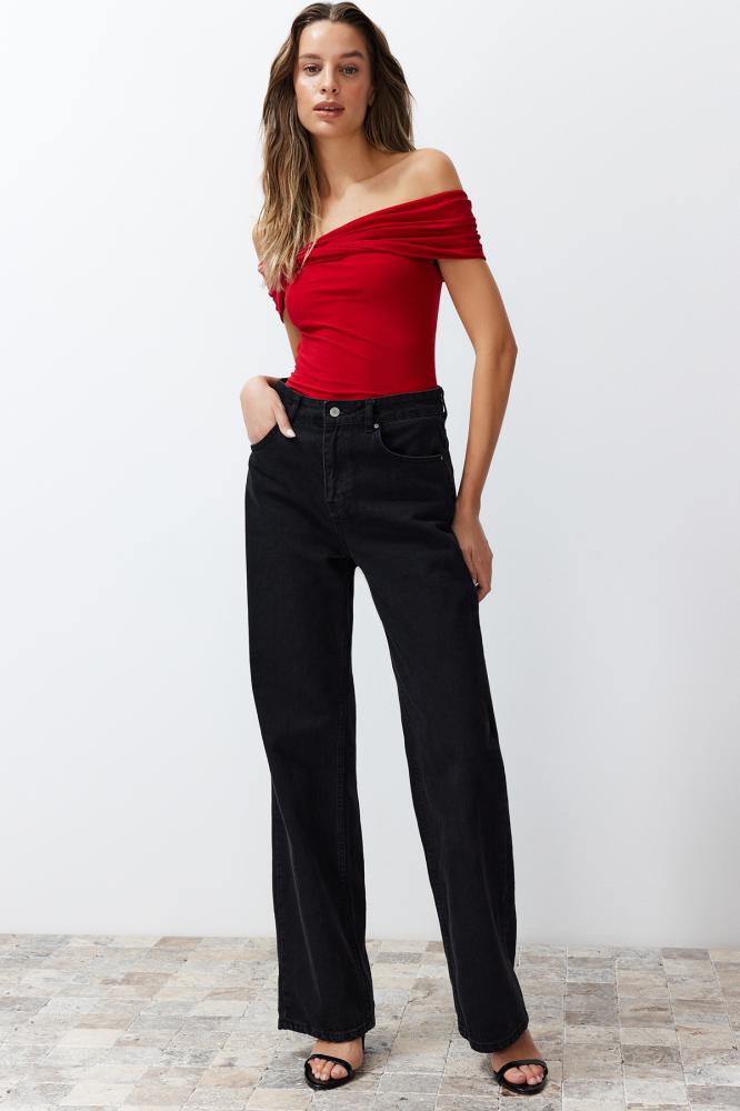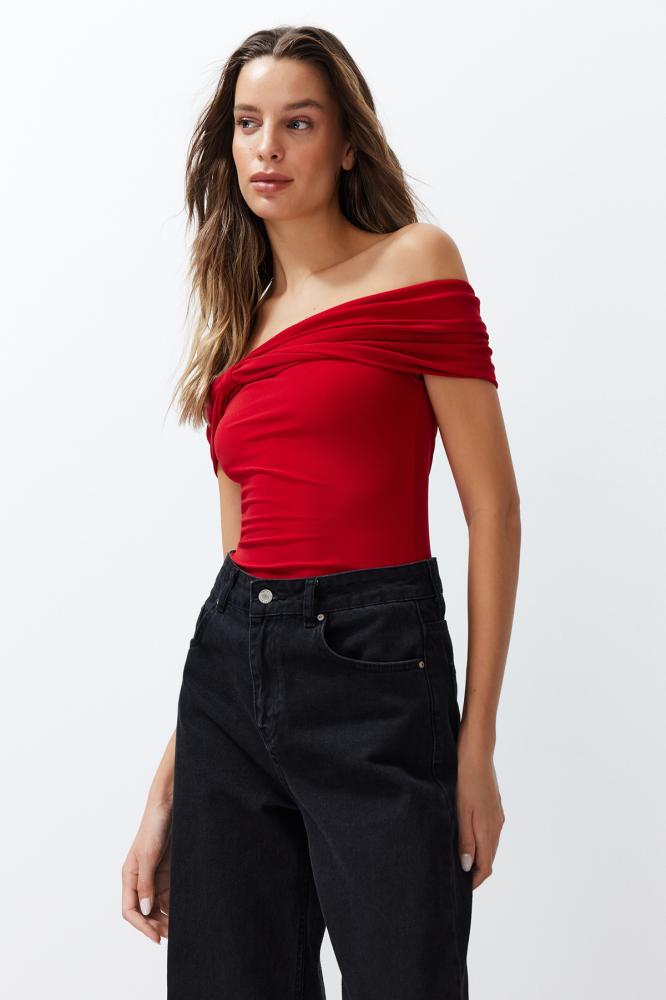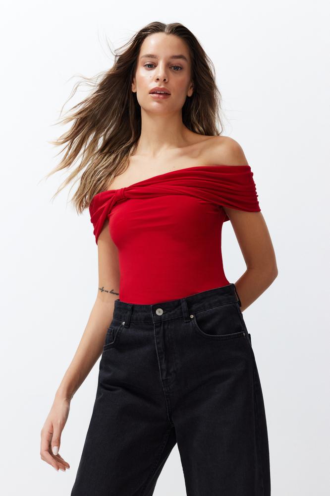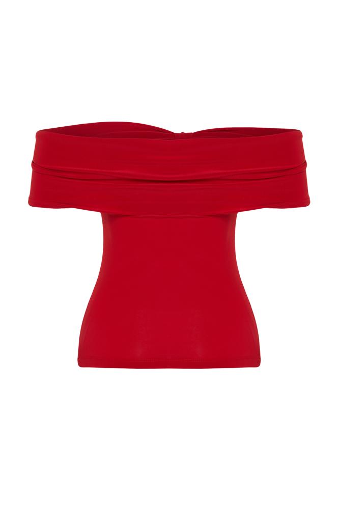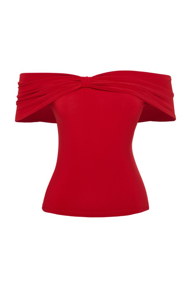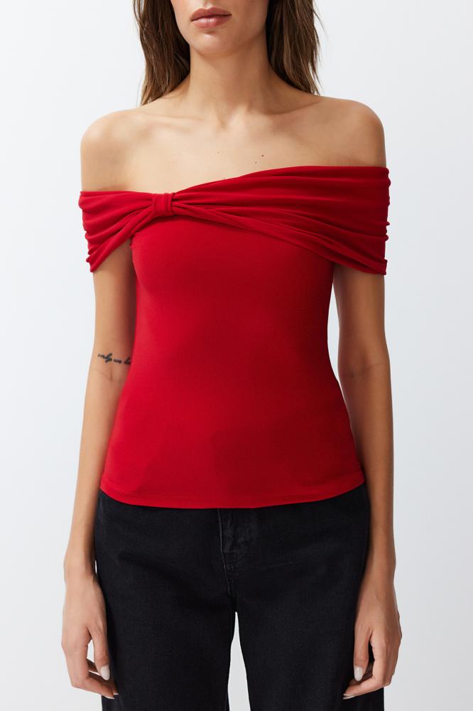 بلوزة قصيرة ذات ياقة كارمن حمراء مرنة - ياقة مادونا، محبوكة TWOSS24BZ00368