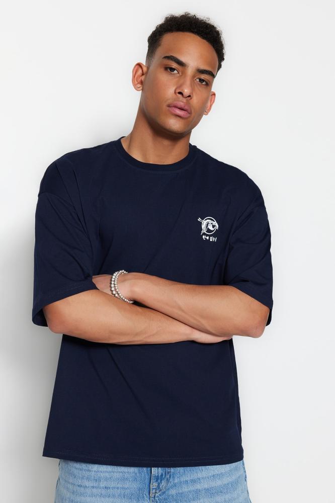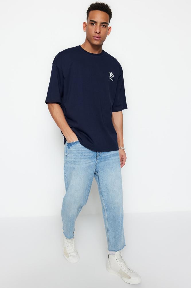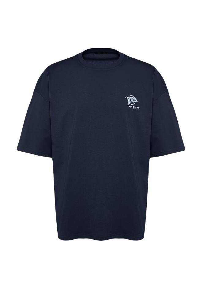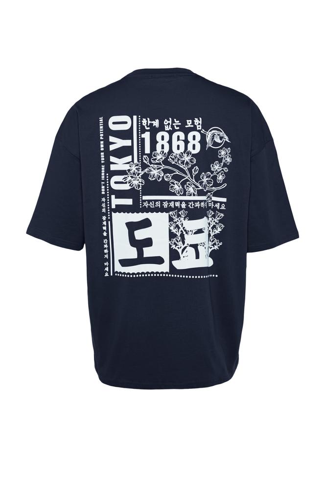 تي شيرت قطني كبير الحجم منقوش باللون الأزرق الداكن - TMNSS23TS00170