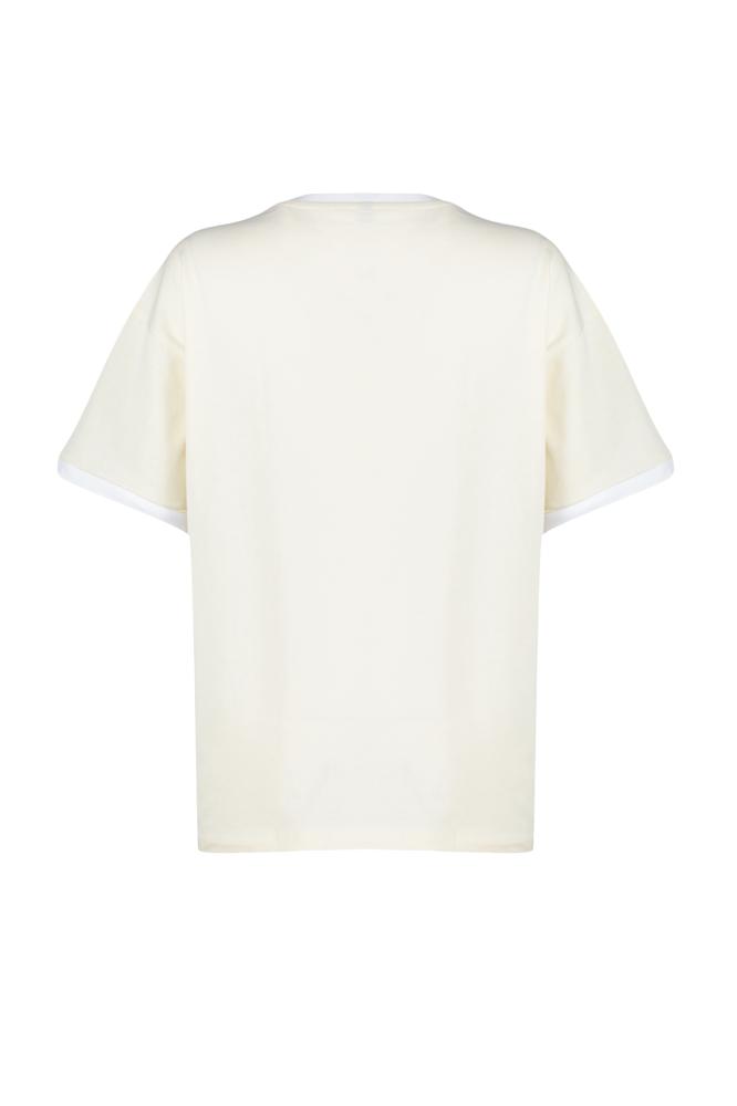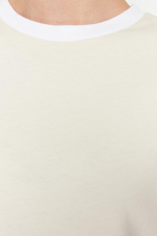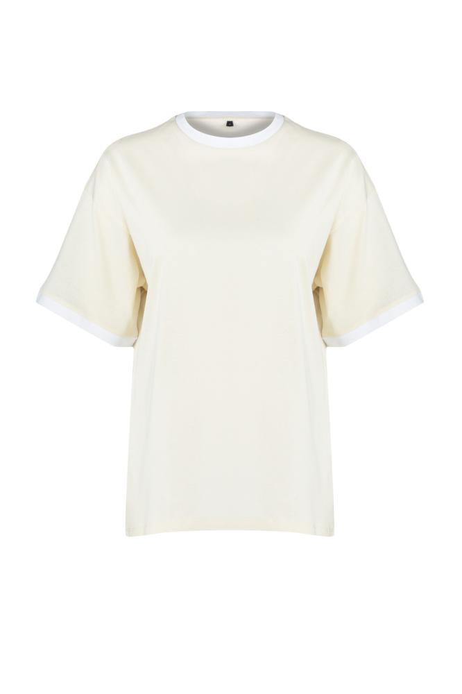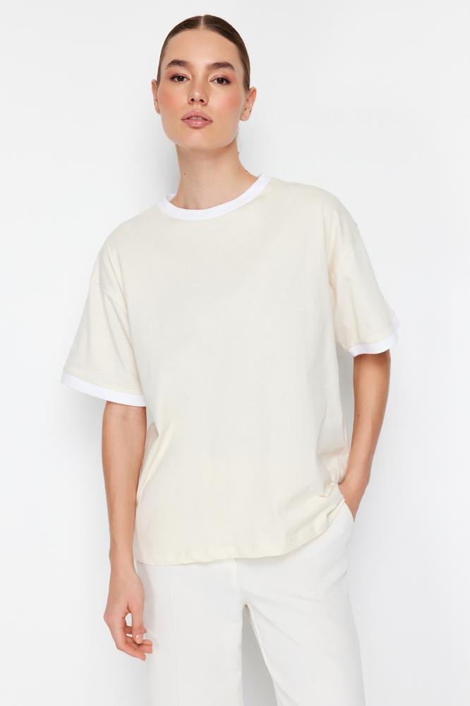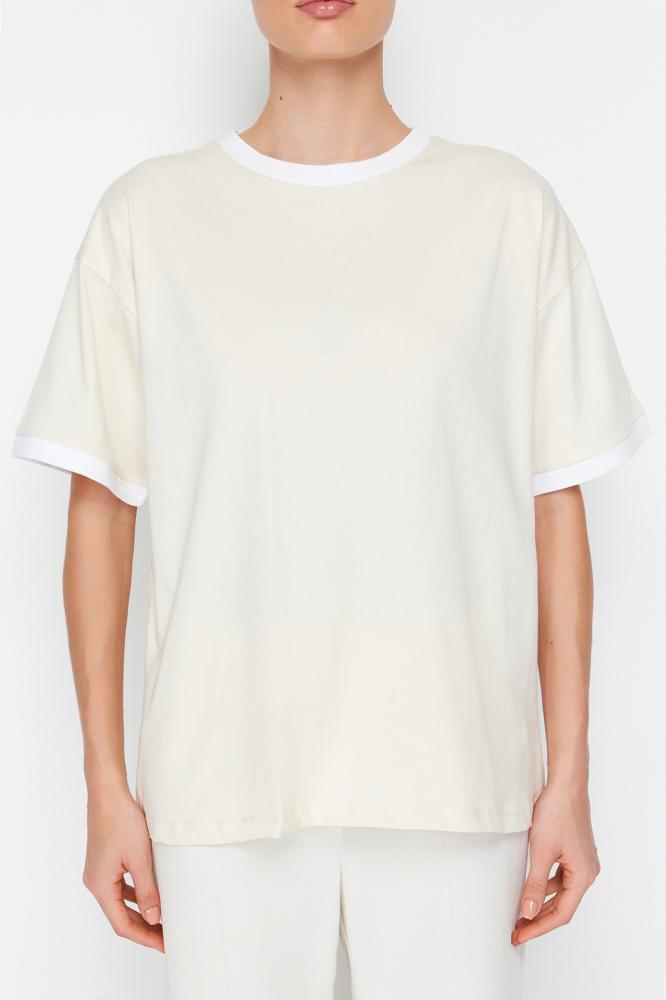 تي شيرت محبوك من القطن 100% بياقة متباينة وشريط مفصل كبير الحجم/قصة مريحة TWOSS24TS00052