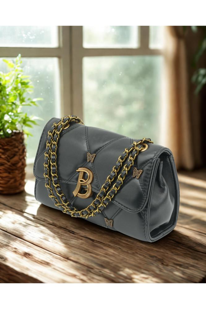 حقيبة كتف فاخرة من جلد البولي يوريثان مبطنة باللون الأسود مع شعار B ذهبي ولمسات فراشة