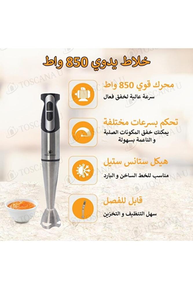 .1-[مُجهز بمحرك قوي يوفر نتائج خلط مُحسّنة].2-[يتيح لك التحكم المرن في السرعة خلط أصعب المكونات بسهولة].3-[يمكن شطف الشفرات بسهولة تحت الماء الجاري].4-[يتيح التصميم النحيف للعصا لهذا الخلاط اليدوي أن يتناسب مع أي وعاء خلط أو قدر أو كوب].5-[يتميز خلاط المطبخ اليدوي هذا بعمود متين من الفولاذ المقاوم للصدأ يتحمل الاستخدام الشاق]. 6-[يضمن المحرك القوي بقوة 850 واط مزجًا قويًا لوجباتك المطبوخة في المنزل يوميًا]. 7-[يوفر تدفقًا مثاليًا للطعام وأعلى أداء ممكن لخلط أسرع وأكثر اتساقًا].8-[يمكنك بسهولة إرفاق وفصل الملحقات لوظائف مختلفة بضغطة زر].9-[تضمن الأشكال الموجية الخاصة لشريط الخلط عدم وجود تناثر أو فوضى أثناء الخلط].10-[يوفر التصميم القوي والمريح الراحة وسهولة الاستخدام للمستهلكين].[تتضمن المجموعة: خلاط واحد، مفرمة كبيرة جدًا، خفاقة واحدة، كوب سعة 500 مل. بفضل محركه القوي وتصميمه المريح الفريد، يوفر الخلاط اليدوي الجديد Everyday خلطًا سريعًا وفعالًا بلمسة زر واحدة، مما يساعدك على تحضير وجبات منزلية صحية بسهولة كل يوم.
