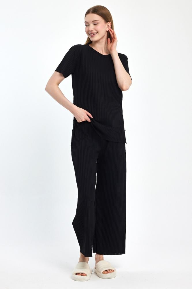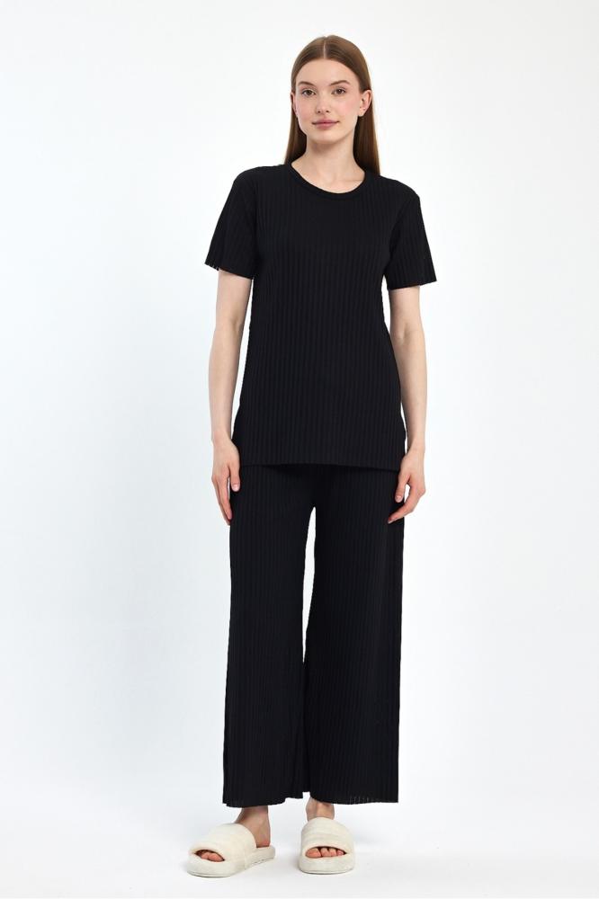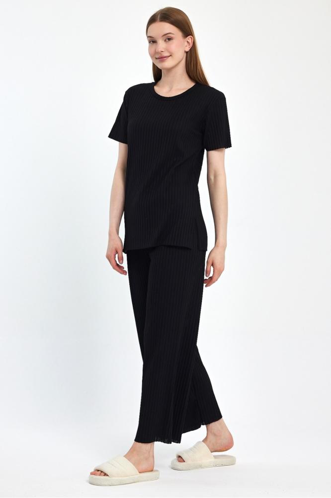 طقم بيجامة نسائية موسمية بأكمام قصيرة باللون الأسود