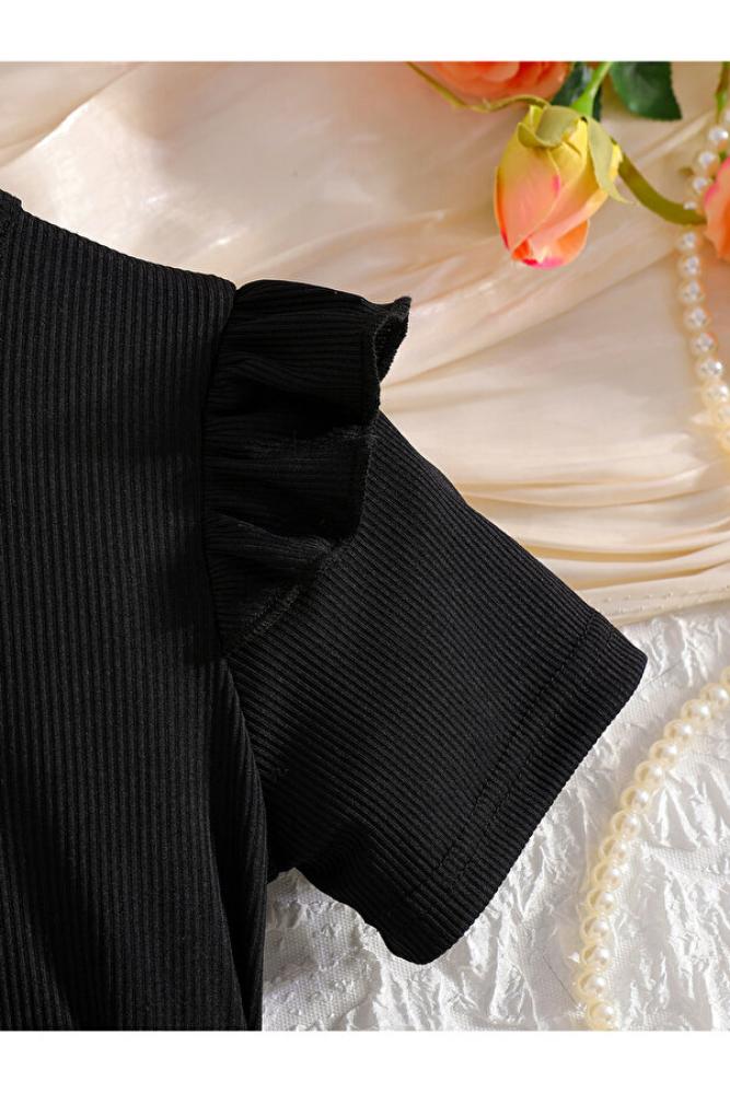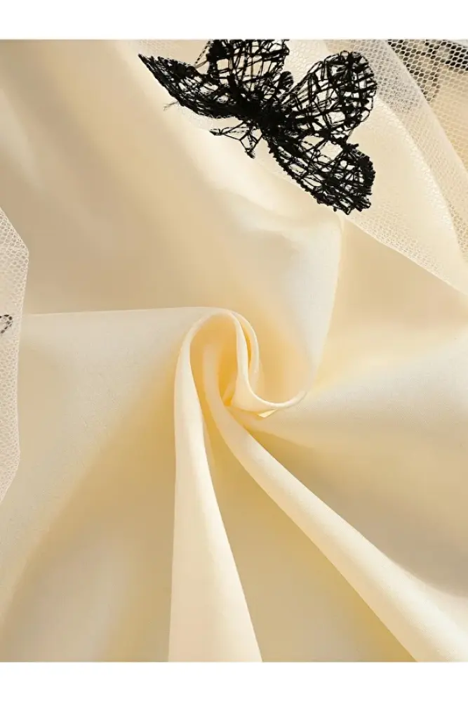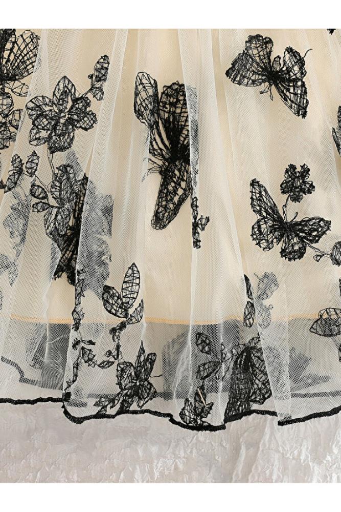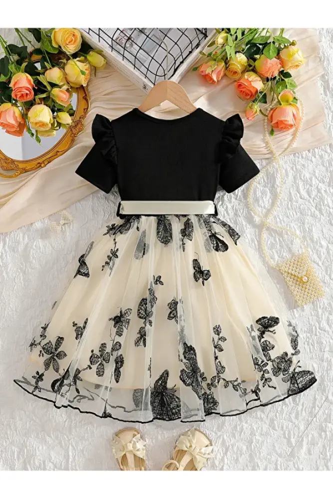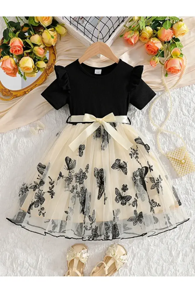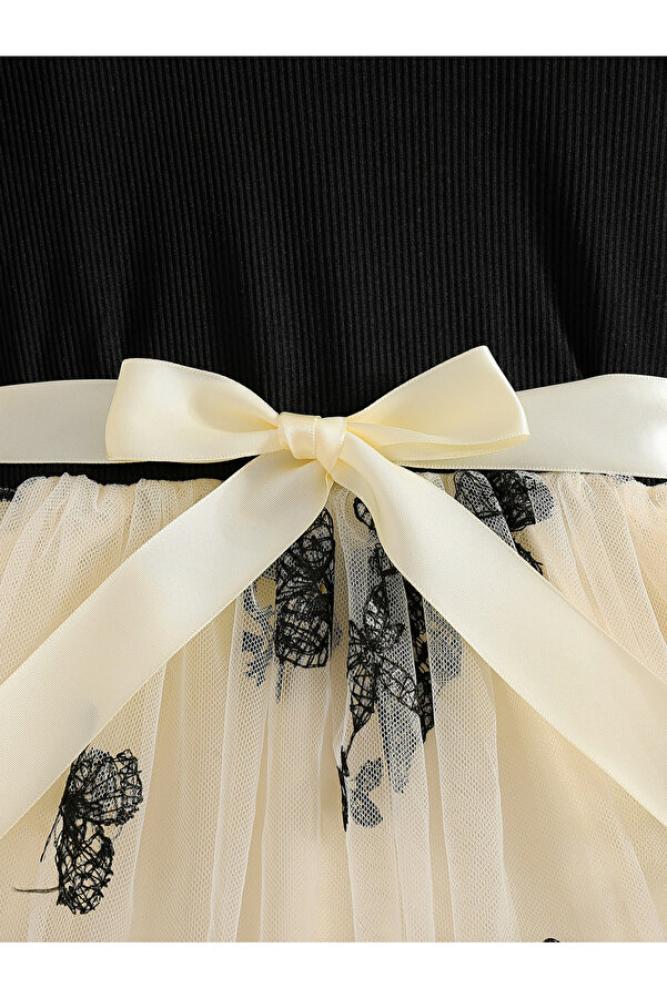 فستان شبكي بطول الركبة مع رقبة مستديرة وتفاصيل فيونكة وحافة مكشكشة