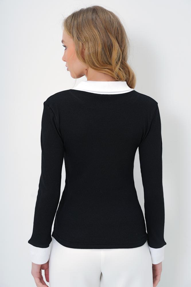 قميص أسود طية صدر السترة كتلة اللون بروتيل المرأة بلوزة - ALC-X13511
